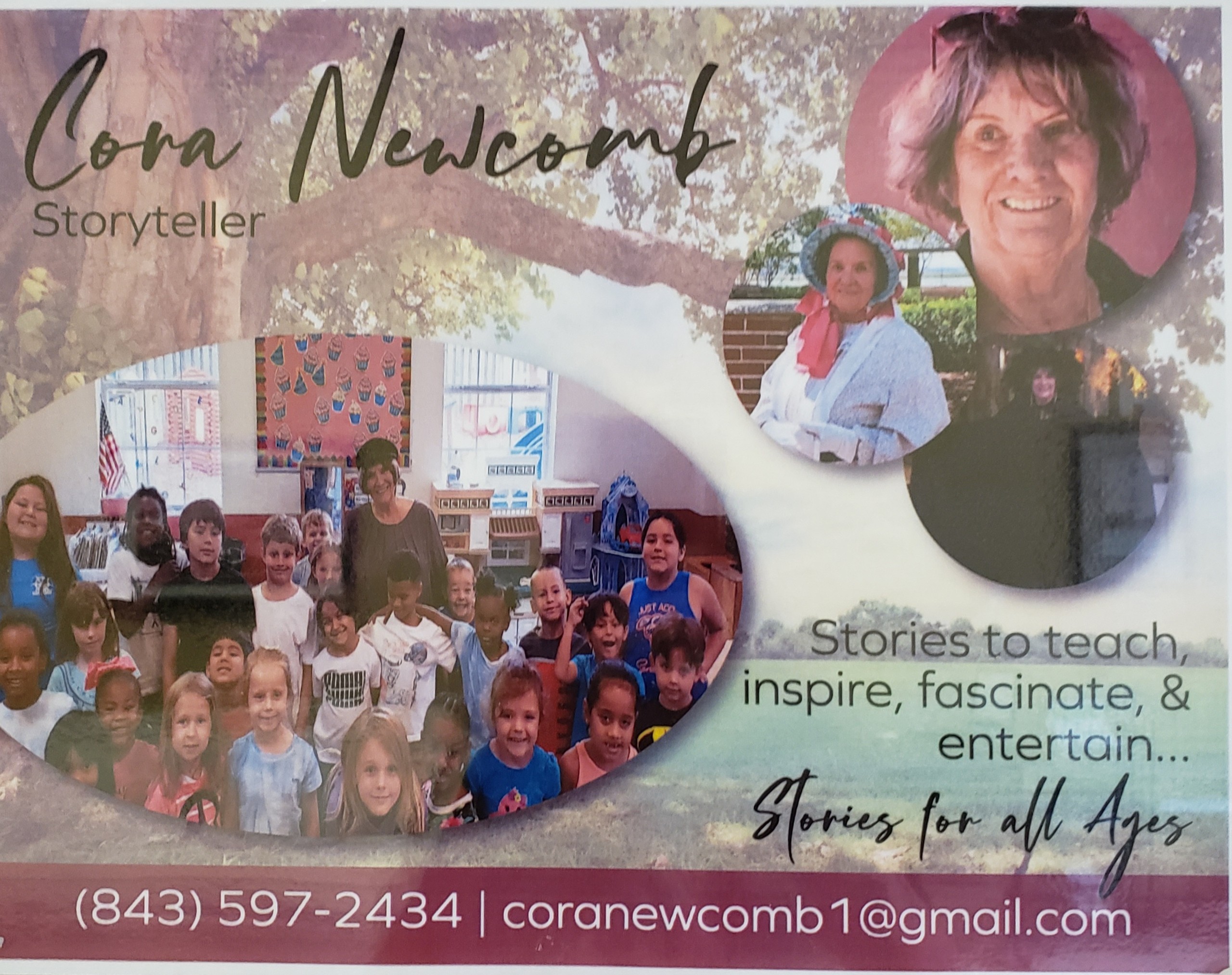 Southern Traditions, beliefs, stories and food – Cora grew up in the charming village of Beaufort, SC. A town founded in 1711 and full of Revolutionary War, Civil War, History of Slavery and Gullah, Witch Doctors and the southern aristocrat. She has been entertaining audience throughout the country with original stories, and traditional tales, and historic tales based around the culture of the south.